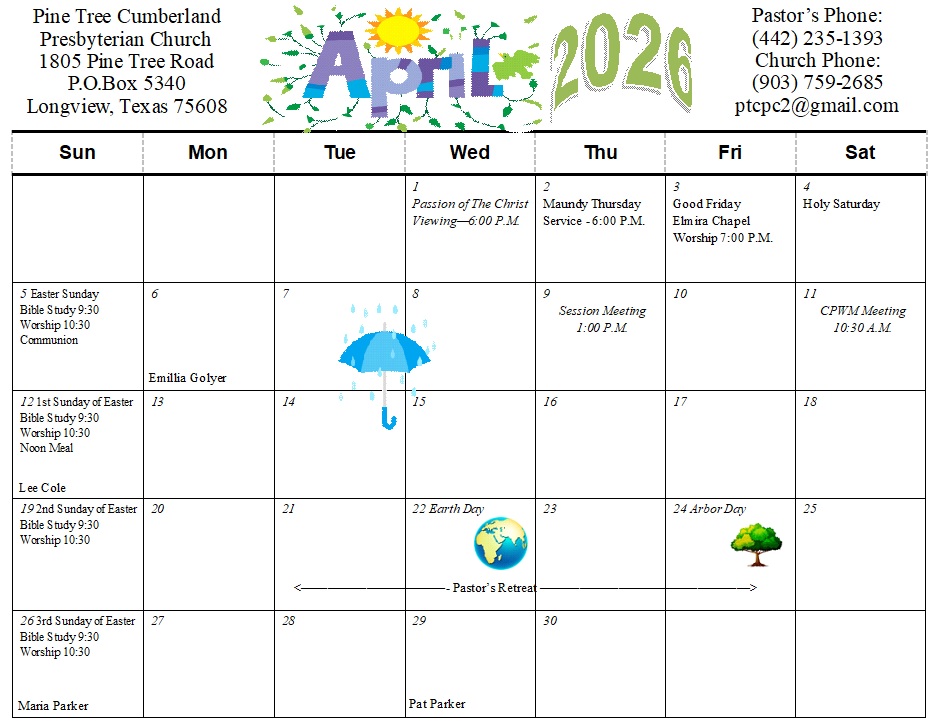 Pine Tree CP Church will host a viewing of Mel Gibson’s portrayal of Christ’s last twelve hours in the movie “The Passion of the Christ” on Wednesday at 6:00 P.M. We will also host a Seder/Communion worship service on Maundy Thursday at 6:00 p.m. in the Fellowship Hall. This service highlights God’s unfolding plan to deliver his people as shown in the connected stories of the Jewish Passover and Christ’s Last Supper with his disciples. All are invited; please let us know if you plan to attend so that we can be prepared! We are invited to join Elmira Chapel CPC in worship on Good Friday at 7:00 p.m. in their sanctuary. This service will focus on the sacrificial death of Christ on the cross. Pine Tree CPC will hold our traditional worship service in the sanctuary on Easter Sunday at 10:30 a.m. to celebrate Christ’s Resurrection.